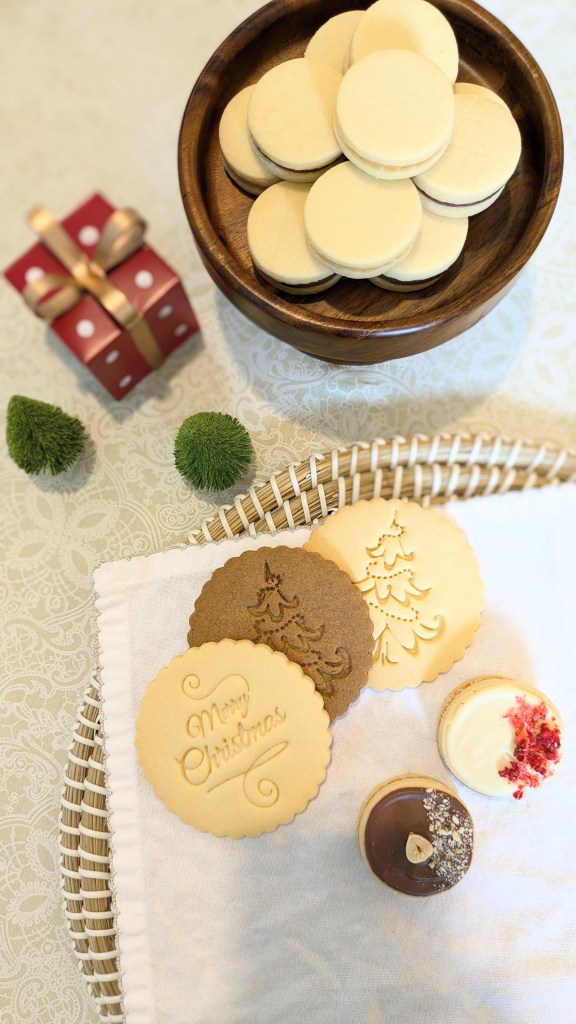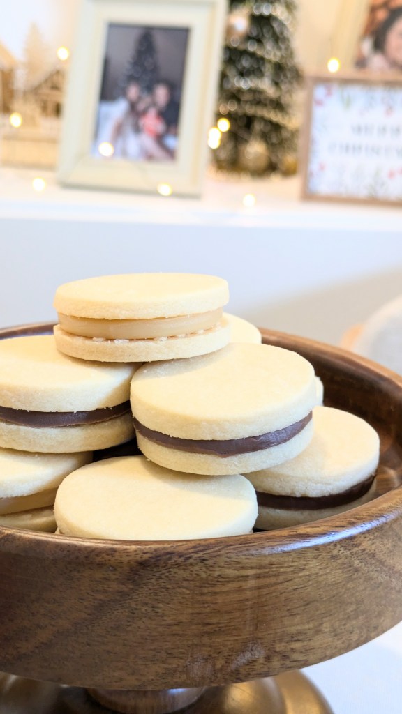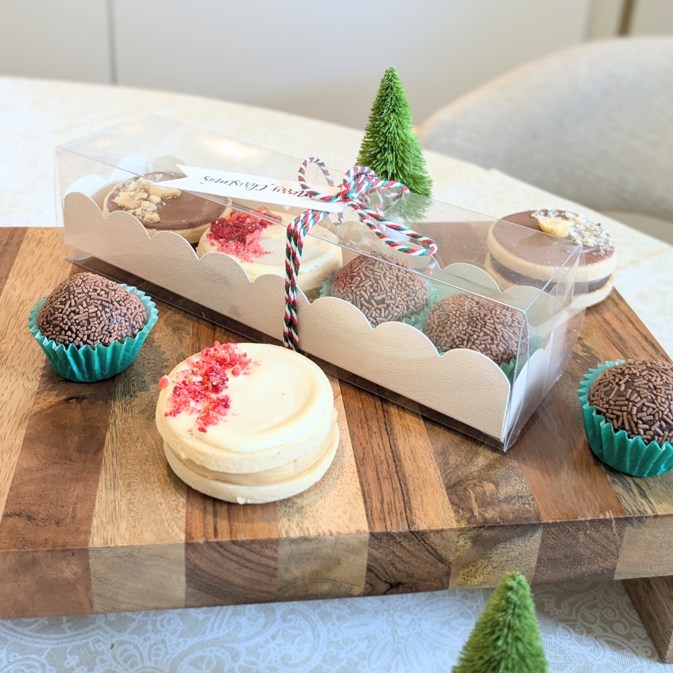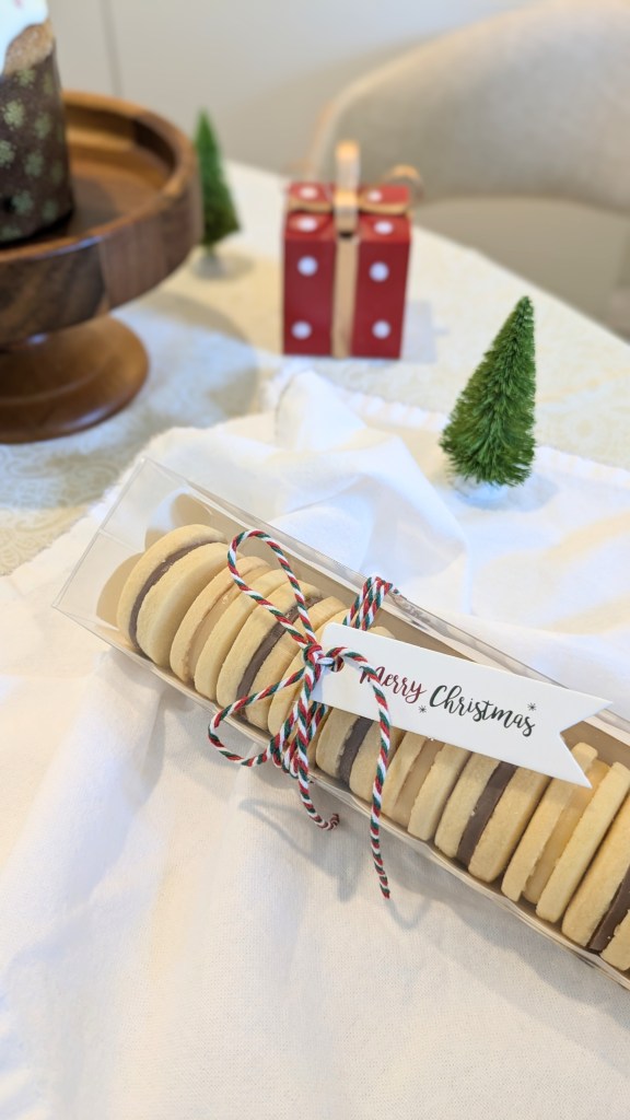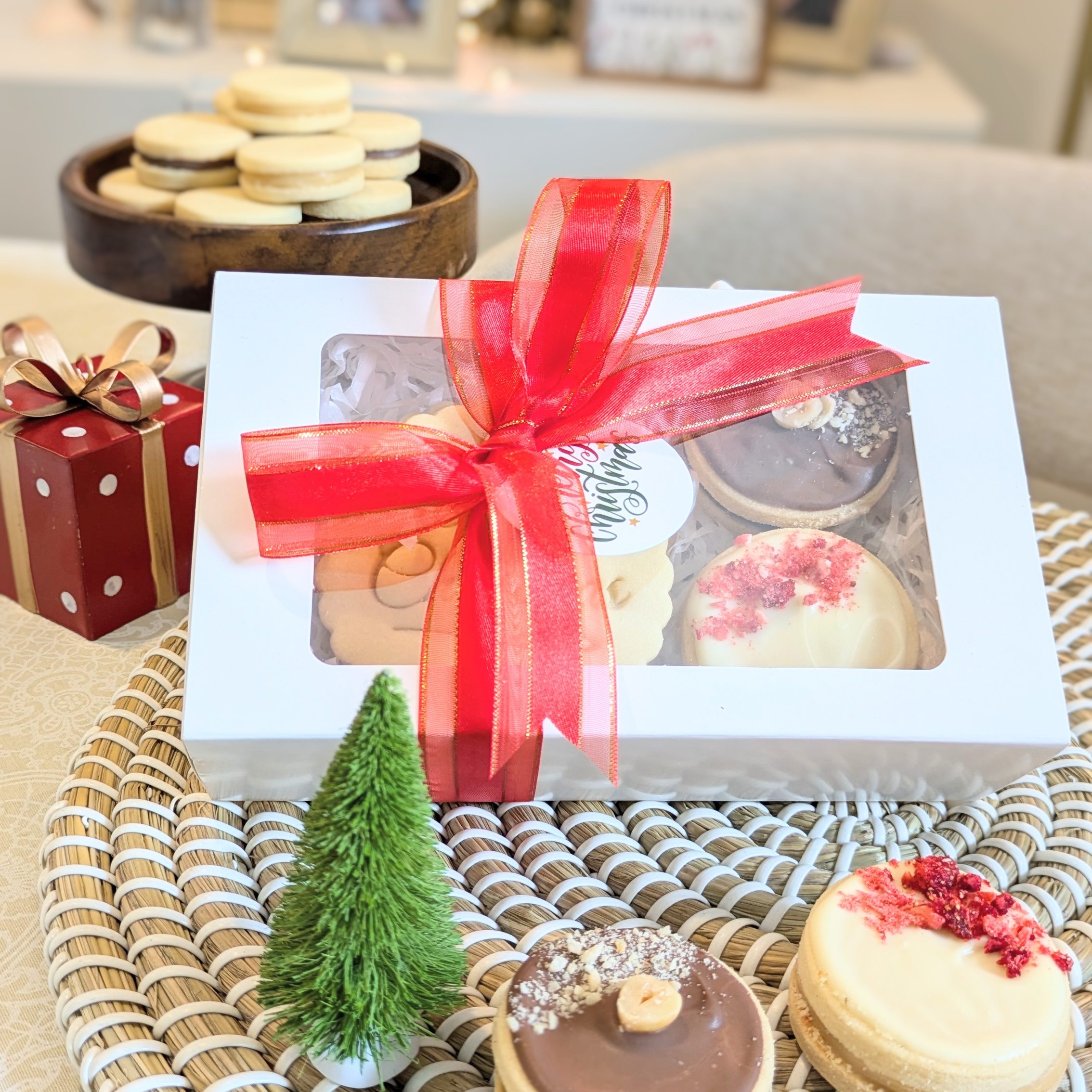 • 2 Christmas-themed milk chocolate shortbread sandwiches.