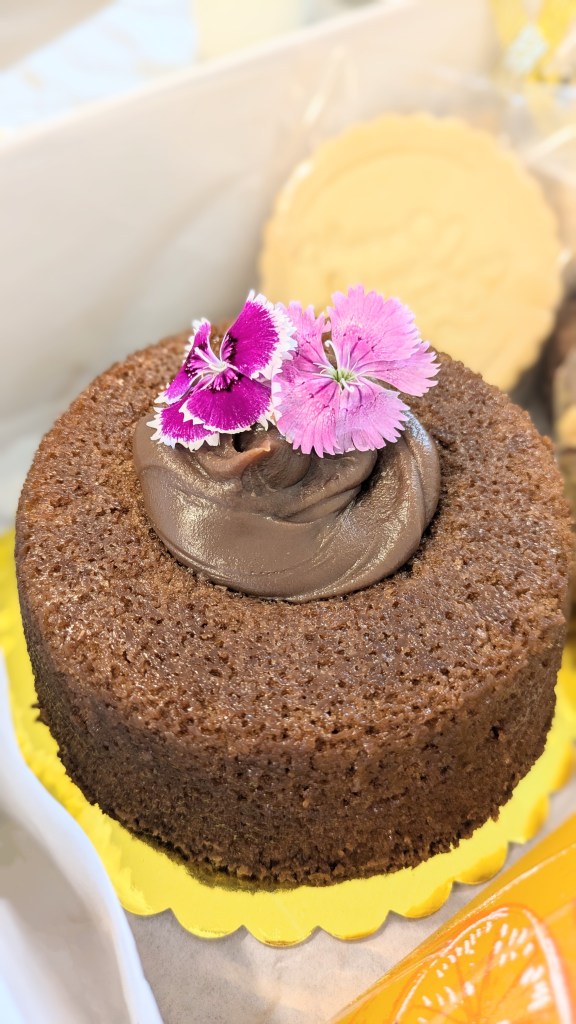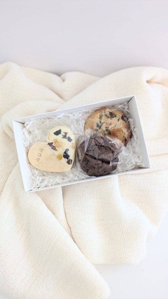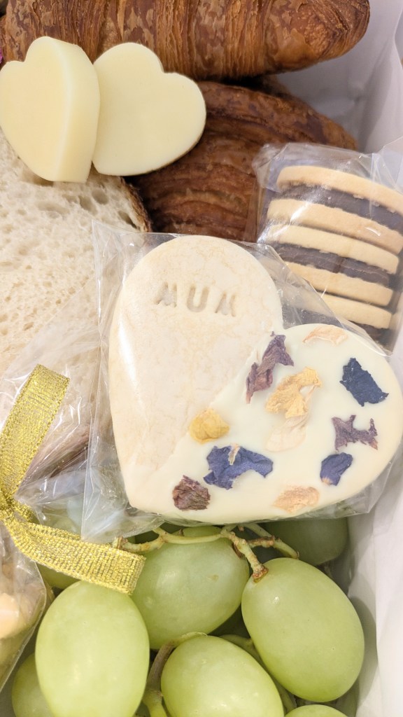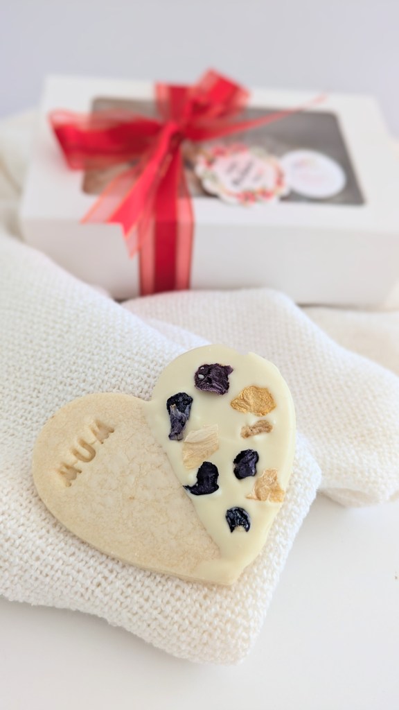 • 1 heart-shaped shortbread sandwiches with white chocolate filling, coated in white chocolate and garnished with dried edible flowers.