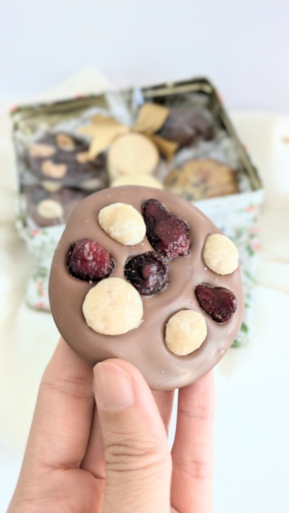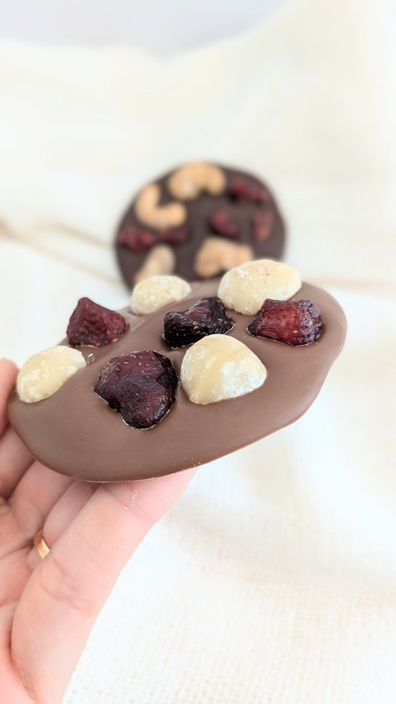 • 1 milk chocolate with macadamias and dried strawberries bark.