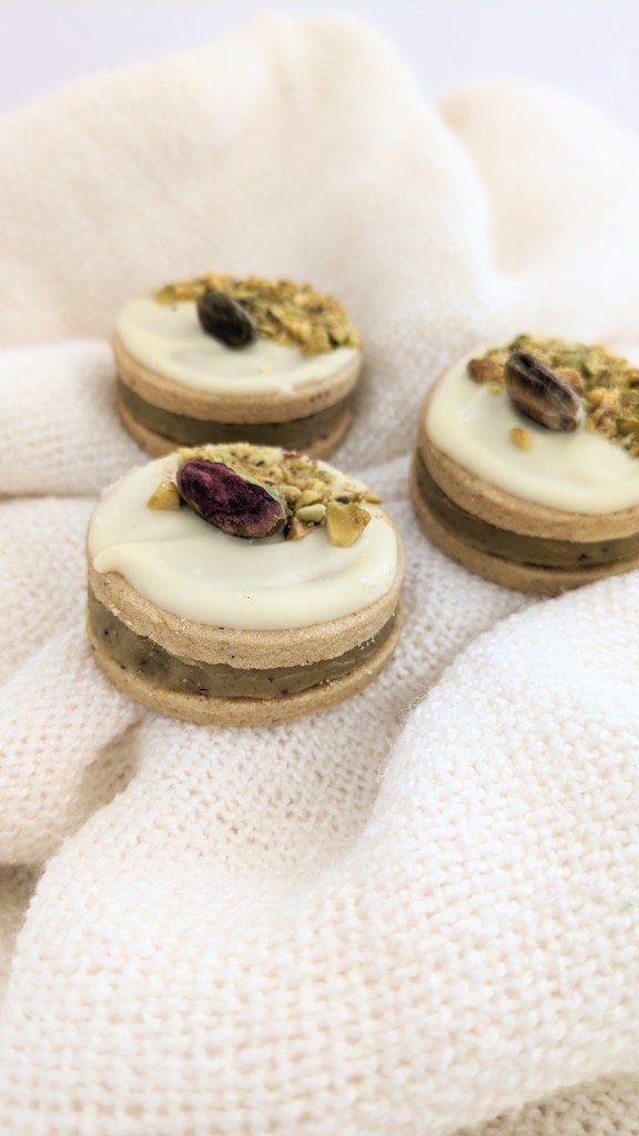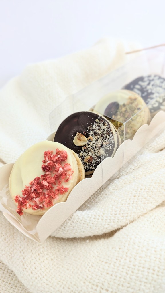• 1 small box with 4 premium casadinhos: Pistachio, Hazelnut & Milk Chocolate, White Chocolate & Strawberry Jam, Passion fruit & Milk Chocolate.