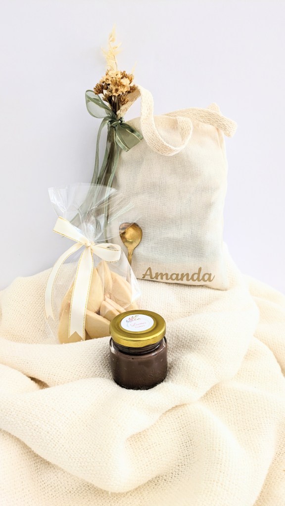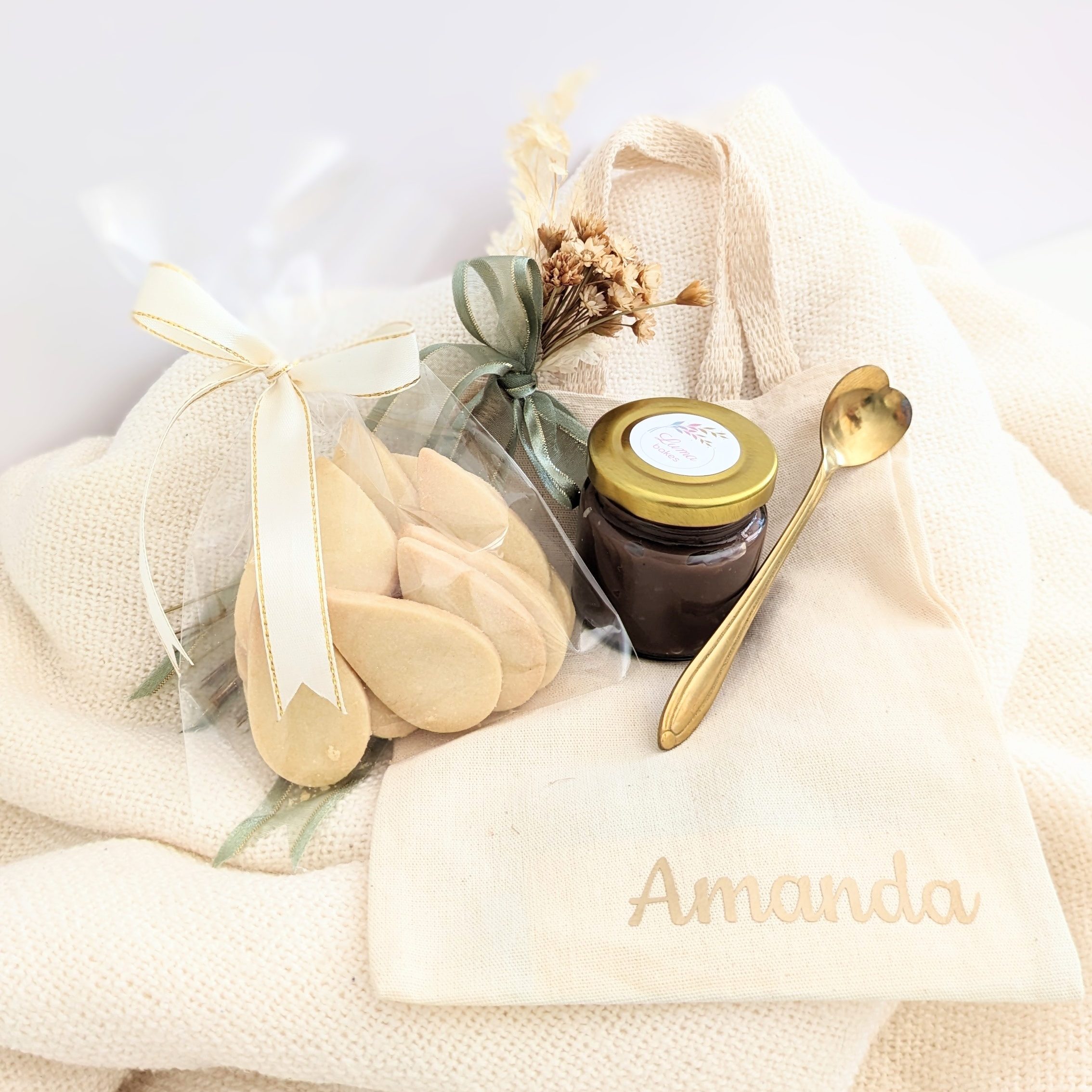 A beautiful customised cotton bag filled with our best seller shortbread biscuit and delicious milk chocolate spread.