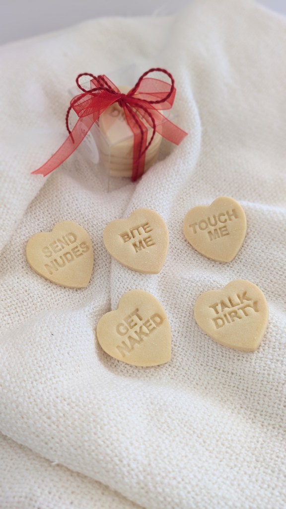 • 7 heart-shaped shortbread biscuits with assorted sexy messages